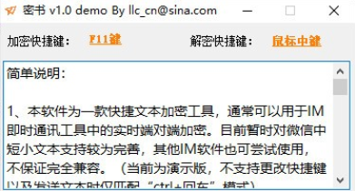 1、本软件为一款快捷文本加密工具,通常可以用于IM即时通讯工具中的实时端对端加密。目前暂时对微信中短小文本支持较为完善,其他IM软件也可尝试使用,不保证完全兼容。(当前为演示版,不支持更改快捷键以及发送文本时仅匹配“ctrl+回车”模式);