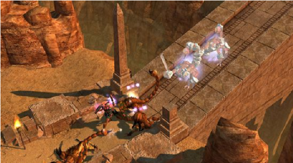 《泰坦之旅:不朽王座》的画面效果更加迷人,情节设定更为丰富,添加了许多新角色和装备。比如进入新作,首先会欣赏到“Plains of Judgment”这个区域,那里的面积相当辽阔,遗憾的是荒芜人烟,到处是造型奇特的岩石和大小不同的深坑裂缝,看到如此危险的环境,没有一定胆量和足够的勇气简直无法向前迈开脚步。