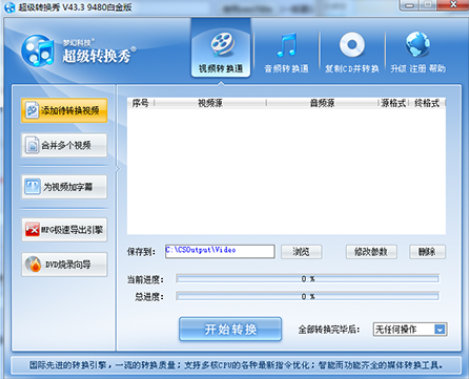 《超级转换秀免费版》是一款全能型影音转换工具,为用户提供音视频转换、CD抓轨、水印添加等优秀功能,在这里用户不论是要转换音频、视频或者CD,它都可以轻松帮助用户搞定。在这款软件里用户可以完美转换视频或者音频文件,保留原文件的质量,支持CD转换为WAV/MP3/WMA/OGG等多种主流的文件格式,非常的方便用户的使用,最关键的是这款软件还不占用用户的空间内存,用户可以安全放心的使用,完全不用担心电脑卡顿的现象发生。