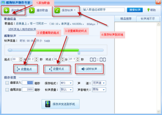 4、支持把在线铃声发送到手机,随意设置歌曲起点和终点,多种铃声转换质量支持。