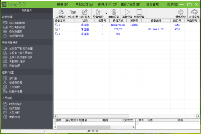7、将设备上的考勤数据下载至软件中(连接设备-从设备下载记录数据);