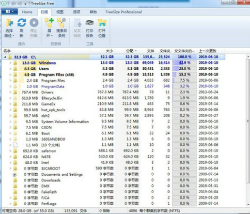 《TreeSizeFree汉化版》这款软件里可以让用户快速的找出硬盘上最大的目录以及它占用的空间,让用户可以随时的知道自己的软件哪个占用空间比较大,TreeSizeFree中文版让用户可以更加合理的安排自己的电脑空间大小,甚至还能分配一些文件数等等,很是方便用户的使用,还采用了目录树的显示形式,让你的操作变得更加的方便快捷,有效率。软件的占用空间还不大,没有广告的干扰,让你可以安全放心的下载这款软件。