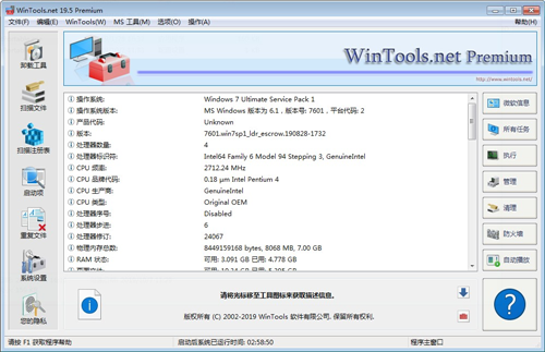WinTools.net主界面显示的内容挺多,包括详细的系统信息、硬件信息。左侧有一排功能按钮,点选以后可以进入详细的操作界面,如卸载程序、清理注册表、清理缓存文件、删除启动项等等,都是比较实用的功能。
