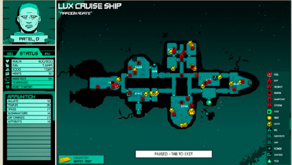你飞到一架飞船上,和毫不讲道理的外星奇异生物搏斗一番或者拔腿就跑,捡干净垃圾燃油和食物,或者见好就收,接着消耗燃油和食物飞到下一架,并且用捡来的垃圾制作强化武器或者任务用品。任务物品会给你大概指一个方向,而布满分支的星图上,去哪里由你选择——只要还有食物和燃油。而无情的电脑会在你任务失败之后“处理”掉并且派来第二个壮丁,虽然他们可能有不同的特性。这些特性也着实有趣——有的色盲只能看到黑白,有的太矮捡不到高处垃圾,有的毛手毛脚发出动静吸引敌人,还有喜欢叫敌人小名这种毫无卵用倒也不添乱的特性。如果随机到特性不好,探索战斗的时候还确实得多加注意,给游戏增添了新的挑战。敌人也是无厘头的:吵闹的烦躁大过攻击力的少年,忧伤到爆炸的真空中球形游客,几个球聚在一起病了还要乱动的的病人,还有时常隐身的幽灵和标准壮汉狱警。在卡通画风下,它们在字面意义上的“吧唧”弹幕中四溅出荧光蓝色液体,可谓自带和谐滤镜。有的时候一扇门上要是出现了弹幕形式的脚步声,多半就有敌人,要小心谨慎。如果它们恰巧没发现你,你也可以偷偷摸走绿色柜子里的垃圾转身跑路。游戏给了你各种玩具质感杀伤力却不小的武器,不过弹药是有限的,更得小心谨慎。