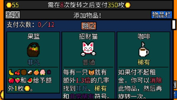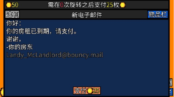 《幸运房东》就是在这样的背景之下诞生的。这款游戏的根本机制脱胎于老虎机,简单来说,就是你租了个房间,房东在房间里放了台老虎机让你赚钱交房租,第一次交25金币,第二次50,第三次100……要交的金币越来越多,一旦金币不够,玩家就会被赶走,游戏结束。