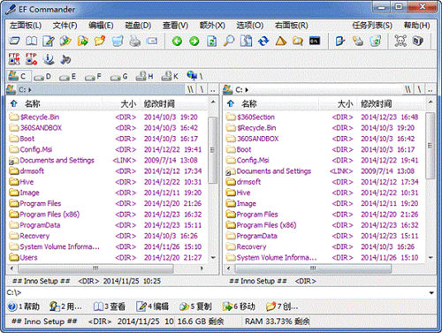 EF Commander是一款强大的双窗口磁盘文件/文件夹管理软件,这个是绿色版本,无需安装即可使用。界面和著名的Total Commander相似。软件采用的是双面板的管理方式,同时浏览不同目录,方便用户进行复制、粘贴、拖动等文件操作。而对于两边的面板,都可以像使用资源管理器一样的树状浏览模式,让用户使用起来更加习惯,不过这个功能不支持右边的面板。基本上,所有Windows资源管理器的功能都可以在EF Commander中实现,只不过操作更方便而已,还有不少快捷方式可以使用,如运行DOS、关机、终止进程等,试用一下,也许你会觉得蛮顺手的。