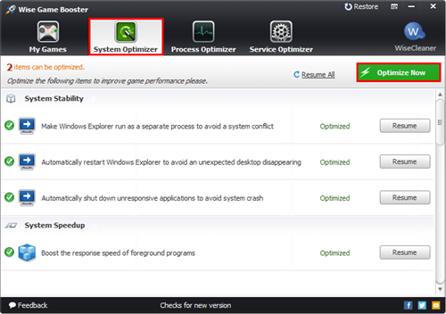 Wise Game Booster不会制造奇迹,它只会帮你找出系统中每一份可用的资源,通过结束这些无用的进程和服务,将这些释放出来的资源提供给游戏程序。说起来很简单,但却非常有效。