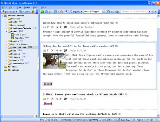 另外,FeedDemon可以与NewsGator Online自动同步,并与Bloglines等流行的RSS服务集成。