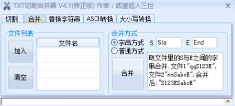 2、按字符串合并:把文件里所出现的S字串到E字串之间的字符提取出来合并成一个文件。比如文件一:“吃超人abc变咸蛋789”,文件二:“aaaaabc2012789”,而S字串为:abc,E字串为:789。合并后的文件内容就是:“abc变咸蛋789abc2012789”。