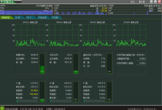 2、网络流量监测,实时显示系统状态,CPU,内存,磁盘读写,磁盘空间使用状态。