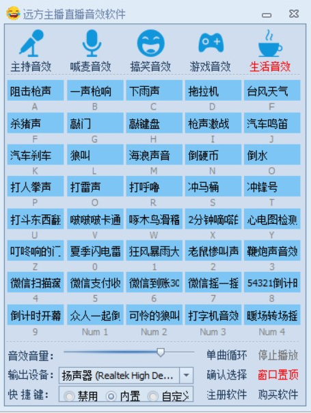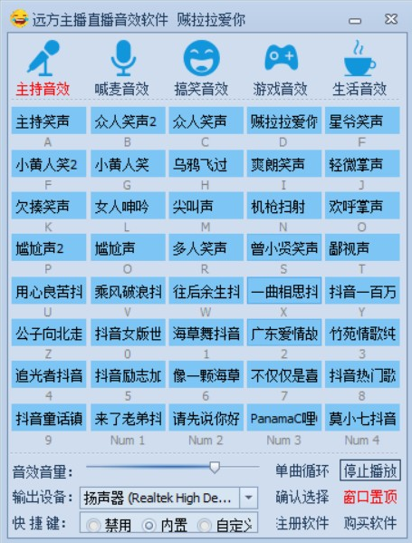 软体包括主持声音效果、喊麦声音效果、滑稽声音效果、游戏音效和生活声音5种类别,共有200个音效按键。