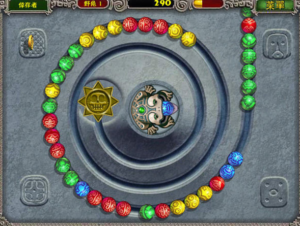 游戏创意虽较简单;但难度不凡。屏幕中的石头青蛙会吐出颜色各异的珠子,与沿着一条轨迹运行的一串珠子相接,一旦三颗或以上的珠子连在一起,则这几颗珠子即可消失。我们所要做的就是尽量消除珠子,以防止珠子滚入轨迹尽头的洞中。珠子落入洞中即为输掉,青蛙将减少一次生命。一共有3次生命机会。在Advanture模式中,每累计到50000分即可获得一只青蛙。
