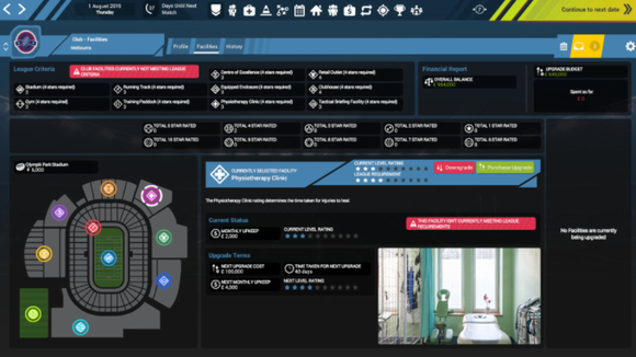 控制所有人员,包括助手,教练,医生和物理医生升级设施,包括体育场,健身房,围场,跑道,