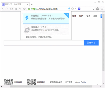 提供IE内核的兼容模式,双核智能云切换: 通常情况下,使用极速模式会获得更好的浏览体验,但是国内一些网站(例如网银)不支持Chrome内核,此时1024浏览器提供了兼容模式。根据不同的网站智能选择模式,不建议手动切换,在遇到特殊情况时可以手动切换。