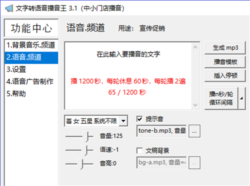 文字转语音播音王,文字转语音播音软件,中小门店播音神器,接近真人发声。含背景音乐、语音两个不同优先级的频道。背景音乐频道用于营造氛围,每次播放n秒或n首歌曲。语音频道用于宣传促销,每次间隔循环文字播音n秒或n轮。语音频道播出时,背景音乐频道自动降低音量或静音。还可制作带背景音乐的语音广告(mp3),放到音响上循环播放。