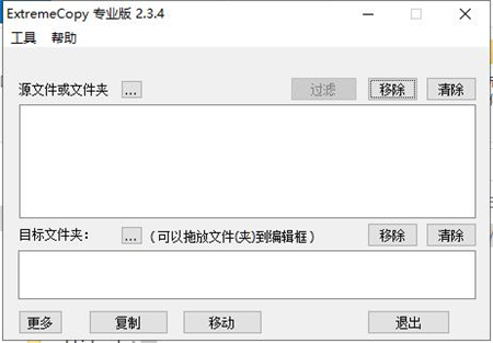 2、设置源文件与源目录与目标文件与目标目录,源文件或者文件夹,过滤、移除、清楚等;目标文件夹包含了可以拖放文件,移除、清楚、更多、复制、移动等。