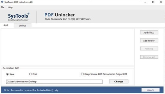 如果用户有多个PDF文件并且所有用户都具有共同的PDF文件限制或某些特殊限制。然后,PDF Unlocker软件可以删除用于打印,复制,编辑和提取数据的PDF密码。对于批处理操作,用户可以使用“添加文件” /“添加文件夹”选项来插入多个PDF文档以用于解锁。