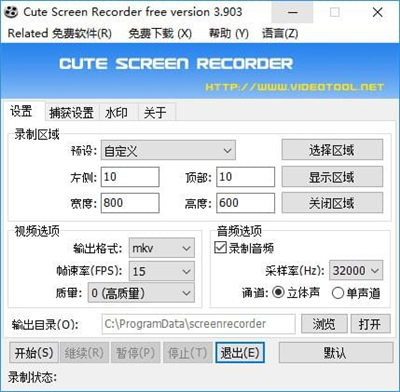 Cute Screen Recorder Free 是一款体积小巧、功能全面的免费屏幕录像工具。可以直接录制屏幕为flv、swf、wmv、mp4文件以便快速上传到网上与朋友分享你的视频。支持全屏录制,自定义区域录制、设定分辨率录制等功能。并且不用学习,界面简单,无需复杂的操作流程,容易上手,易于使用,完全免费!