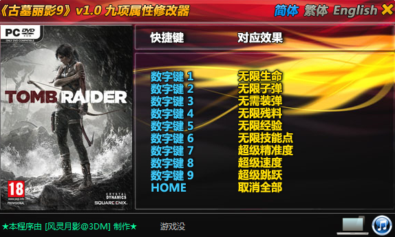 古墓丽影9修改器由3DM风大制作,充满了各种有趣的小设置,哈哈哈让你免费修改游戏数据,支持游戏内的九项属性修改,可以修改无限生命,无限子弹等,让游戏变得更加的简单!