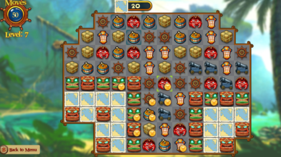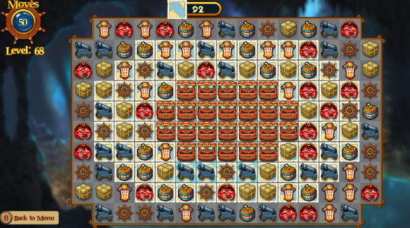 排列3只及以上的螃蟹、大炮、船舵、炸药和其他海盗物品为一组,解锁强大的强化道具并完成所有关卡目标。