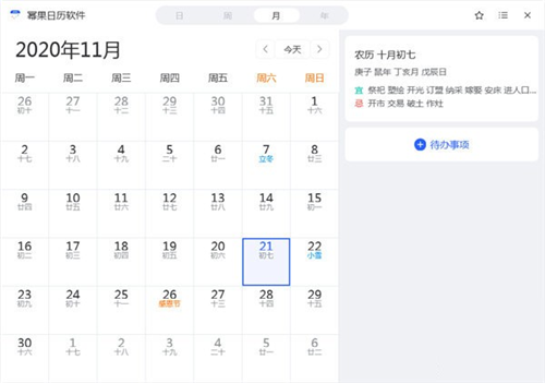 幂果桌面日历官方版是一款简单好用的桌面日历软件,同时它也是一款详细的日程表工具,可以添加各种代办事项,定时提醒用户防止遗忘。软件提供了简约美观的日历界面,您可以查看年、月、周、日等日期信息,并支持查看对应的农历数据。并且为用户提供了对于待办事项的支持,自定义待办事项的参数,自由使用。需要的朋友一定不要错过!