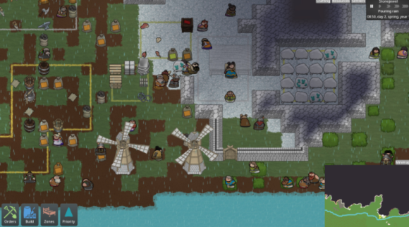 这是一个重要的设计目标,即有可能在玩整个游戏时不与其他派别发生武装冲突(如果你选择的话)。虽然武器和战斗可能是游戏的重要组成部分,但我们想确保你能和平地建立起一个功能齐全的城镇,以便有满足感地坐下来,看着你的定居者在"艺术农场"式的游戏中进行他们的工作。