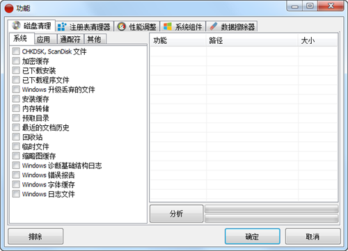 带有多个标签页,分别是清理系统垃圾,清理常用浏览器或者软件产生的垃圾、清理特定后缀名的垃圾文件。