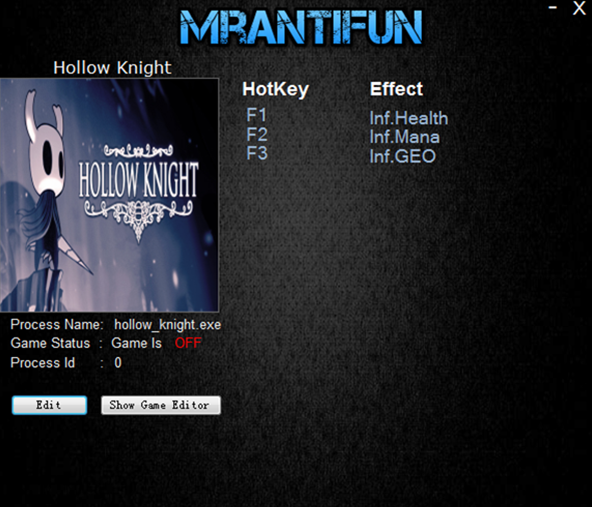 空洞骑士三项修改器是一款游戏辅助工具,独创各种数据修改,提供多样化的快捷方式修改、键盘一键修改,它提供无限生命、无限魔力、无限金钱等功能,能够增强游戏人物的战力,操作简单,让玩家可以更轻松的去体验游戏。空洞骑士修改器运用简单,玩家先运转游戏后,再发动空洞骑士修改器,按下其中显示的热键,即可使用对应的功能。
