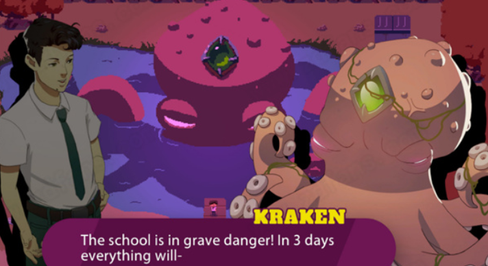 海怪学院是一款2D像素风格以及克鲁苏结合校园为主题的冒险解谜类游戏。本游戏由Fellow Traveller发行,游戏中玩家将要跟随主角一同去海怪学院体验那美好的校园生活,只不过令他没有想到的是这个学校跟他想象中的有亿点点不一样。玩家将会在学校中见到各种各样的奇妙事件,比如正在举行召唤恶魔仪式的邪神教徒,正在吞吃学生的怪物鳄鱼,以及遇见那可爱的西兰花少女(西兰花成精了!),并且还有那具有神奇力量的章鱼海怪等一些让人三观崩坏的场景,当然您所看到的仅仅只是冰山一角而已,这个学院的神奇之处可不仅仅只有这些哦!如果想要探寻学院的真相的话,那就前往学校内的四个神秘社团之中,发现那被掩盖着的秘密,解开它的真正面目吧!游戏内玩家将会与海怪学院中的大章鱼签订契约,它将赋予您将时间进行循环的力量,利用这强大的力量将那入侵学院的恶魔,怪物全部摧毁掉吧,并且从蛛丝马迹中将那祸乱校园的幕后黑手给揪出来吧,与大海怪一起保护这个学校与世界。游戏中的四个社团分为充斥着重金属摇滚的音乐社,拥有海量鬼魂的艺术部,拥有着强大肉体的体育社以及自命不凡的话剧部,而您所需要做的就通过那时间循环的力量,打入这四个社团的内部,得到关于这个学院的秘密,并且从一些幕后黑手所遗留下来的线索中将其找出。游戏中玩家会遇到非常多的伙伴,他们将来自各个种族,比如音乐社中的漂亮主唱弗拉基米尔,这个名字是不是感觉很耳熟呢?没错,他就是一个来自英国的吸血鬼以及可爱的鼓手西兰花小妹,真的就是西兰花哦,只不过她还有一个人类形态,不过只有极高的好感度才能够看到哦,还有暴躁的贝斯手西蒙娜,看着她天天穿长颈鹿连帽衫的样子,我都有点怀疑她是兽人了,玩家需要集结他们的力量一起与邪恶进行战斗。