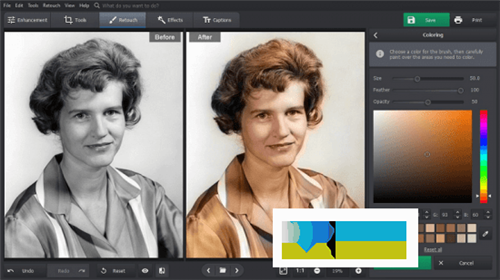 如果照片中的某些细节需要微调,您可以手动进行修饰。为此,请转到“润饰”选项卡并选择“着色”工具。现在,设置画笔大小,选择色调,然后在要更改或改进的图片部分上进行绘制。要匹配现有颜色,请使用吸管工具从图片中选择必要的阴影。