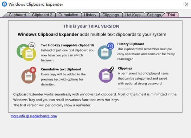 《Windows Text Clipboard Expander免费版》这款软件是非常强大的,可以帮助用户进行剪贴板扩展操作处理,让用户在进行文本编辑的过程中获得许多快捷的帮助,Windows Text Clipboard Expander这款软件这样也更加有效的提高工作效率,使用的过程中可以添加多哥剪贴板,使用的过程中也会体验更加便捷,作为计算机最常用的功能,可以增强Windows文本剪贴的作用,帮助你有效的提高工作效率,快来下载体验吧。