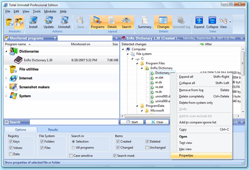 Total Uninstall (软件安装卸载监视)能帮你监视软件安装的所有过程,记录下它对系统所做的任何改变,比如:添加的文件、对注册表和系统文件的修改,并制作成安装前和安装后的快照。卸载软件时,不需要使用卸载程序,直接通过该软件便可将其完全地清除出系统,不留下任何痕迹。从而保证了系统的清洁。
