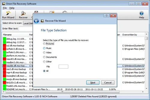 Orion 文件恢复软件会打开一个向导,该向导将指导您完成搜索和恢复文件或永久删除文件的过程。