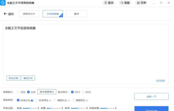 打开文字转语音功能,输入文字内容,选择背景音乐和输出格式,选择语音类型和声音设置,然后点击开始转换。