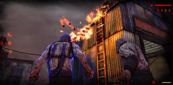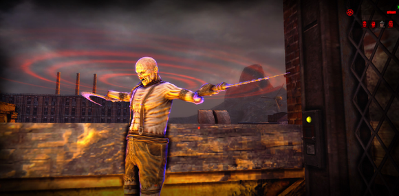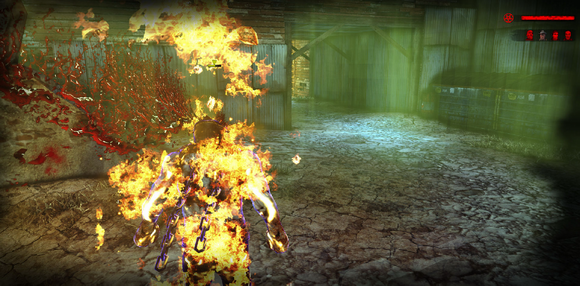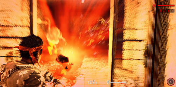 除了武器之外.主角还有一项专长就是近身攻击.用脚回旋踢(类似生化危机5的男主角依样).而且不是只有在地面踢.跳起来也可以飞踢.....只要是快要死掉的僵尸.只要用飞踢就可以踢爆他们身体让他们血肉横飞~爽阿...