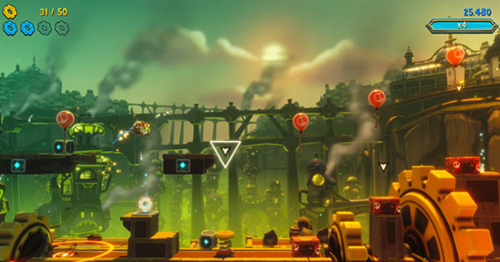 游戏中每一关都会依据操作精度来进行评分。除此之外,要挑战新的关卡就需要收集足够多的齿轮零件。当吉格斯撞到障碍物、敌人时,不会直接结束关卡,而是陷入阴影状态。此时只要完成一次按键就可以恢复。注意阴影状态下收集到的齿轮都不会计入最后的关卡结算。
