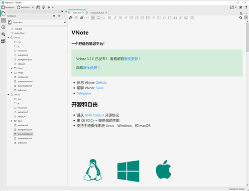 开始之初,VNote是一款专为Markdown设计的Vim风格笔记应用程序。它不仅仅是一个Markdown编辑器。VNote旨在成为一个带有便捷笔记管理的功能强大的Markdown编辑器,或者一个拥有舒适Markdown体验的笔记软件。