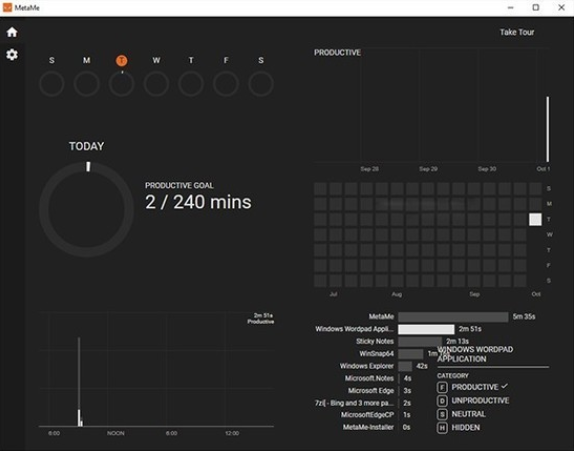 3、MetaMe是可定制的,这意味着您可以告诉它哪些应用程序有效,哪些无效,当然,它生成的最终报告取决于您的选择,分析活动的方式不只一种,您有每日,每周和每月的提要,所有这些都结合在一起可以显示您最有成效的时刻。