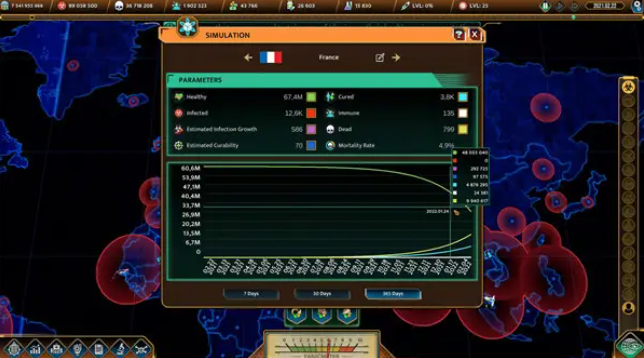 病毒会通过变异来适应人类的身体,所以你必须预测它的传播能力、变异节点、耐药性等等。你将决定一个国家是否应该关闭边境、隔离公民以减少感染人数,或者建造新的临时医院和紧急帐篷以加快感染者的康复时间,这些都要求你做出明智的选择。