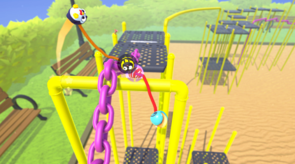 在《终极拉扯》中,两名玩家分别系在可伸缩的弹力绳两端,组队跨过绚丽而混乱的障碍竞速场。