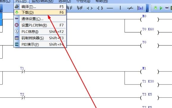 5、在菜单栏中的依次点击PLC-下载或者按F6把程序下载到机器中即可;