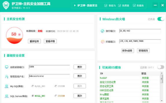 1、软件支持快速管理防火墙,支持关闭危险IIS模块。