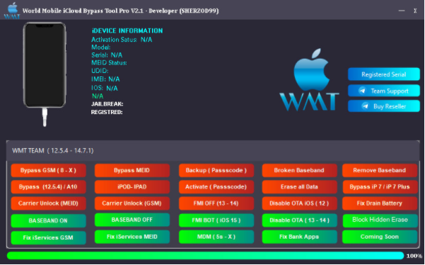 world mobile icloud bypass tool正式版可以支持包括iphone、ipad等多种型号的设备,当你忘记苹果设备密码、苹果设备被锁的时候可以使用它来绕过解锁,操作容易、有着十分强大的性能。