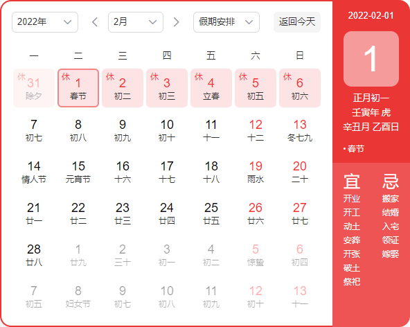 2022年1月31日(除夕、周一)-2022年2月6日(初六、周日),共放假7天,其中2022年1月29日(周六)、2022年1月30日(周日)正常上班调休。