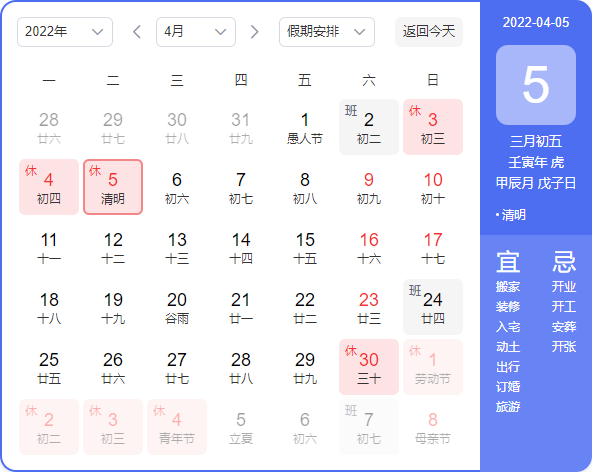 2022年4月3日(周日)-2022年4月5日(周二),共放假3天,其中2022年4月2日(周六)正常上班调休。