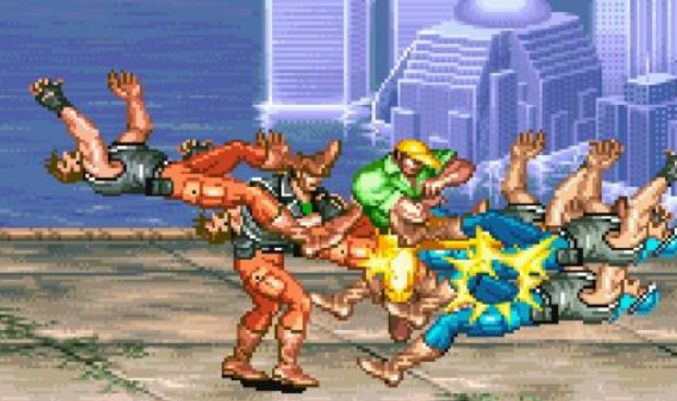 2、舞台设定在恐龙和人类共存的26世纪。在此作品中,道具的作用得到了很大的强化,所有的枪械道具都有弹药的概念,弹药用完就只能作为一次性的投掷道具了,甚至可以抢到Boss的武器来反制。像木桶一类的容器道具不再是仅仅为得到其中的物品被砸破了,它们可以被抬起投掷出去。