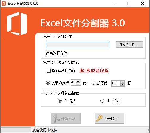 excel文件分割工具官方版能够完美支持多个版本的excel,使用起来十分简单方便,仅仅只需要几步就能完成,将庞大的excel文件分割成小部分,提升工作效率!可将任意大小的excel文件平均分成多份小的excel文件。如可将1000行的excel文件平均分成4个250行的excel文件。支持excel2003,excel2007,excel2010。使用前确保您的电脑已安装framework2.0。