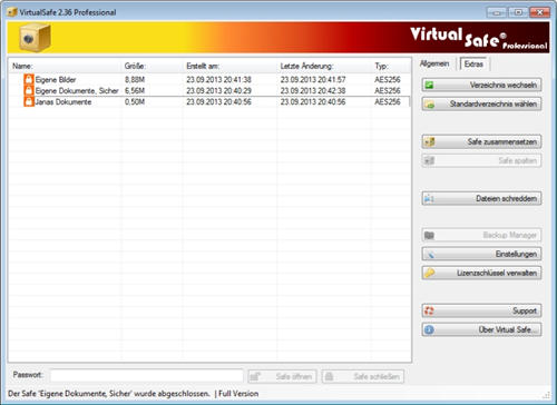 您想安全地存档数据吗?然后,您可以轻松地将保险箱分成几部分,然后将它们放到网上存储或磁盘上,轻松自在。只有在主控部分和保险柜的所有片段的帮助下,数据才能放回原处。Virtual Safe Professional在各个部分中放置了许多随机错误字节,这几乎使再次解密数据几乎成为不可能-当然没有主部分,该主部分确切地知道在哪里可以找到错误的字节。