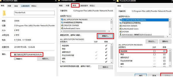 2、右键【ThunderPush】文件夹,选择【属性】,勾选【只读】;然后再【属性】中找到安全->编辑->完全控制,勾选【拒绝】,点击【应用】,再【确定】即可。