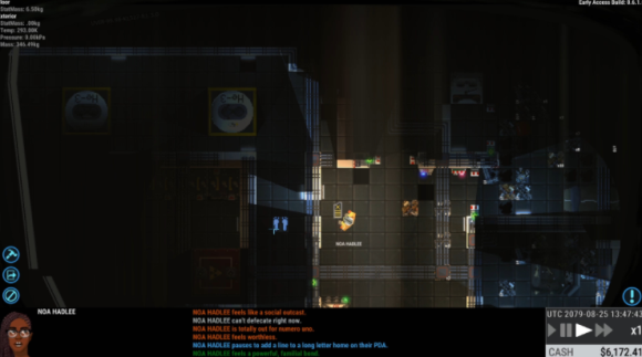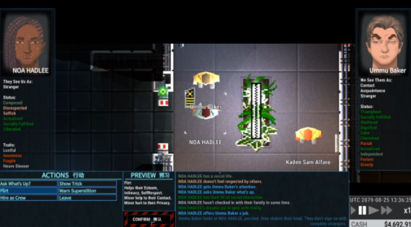 Ostranauts的挑战在于其提出的决策,而不是玩家的耐力或反应时间。它具有暂停和快进功能,使玩家可以按照自己的节奏进行游戏(类似于其他管理模拟游戏)。玩家可以在累的时候休息。同样,如果感到无聊,则可以快速前进,并且当某些东西需要玩家注意时,游戏会自动停止。